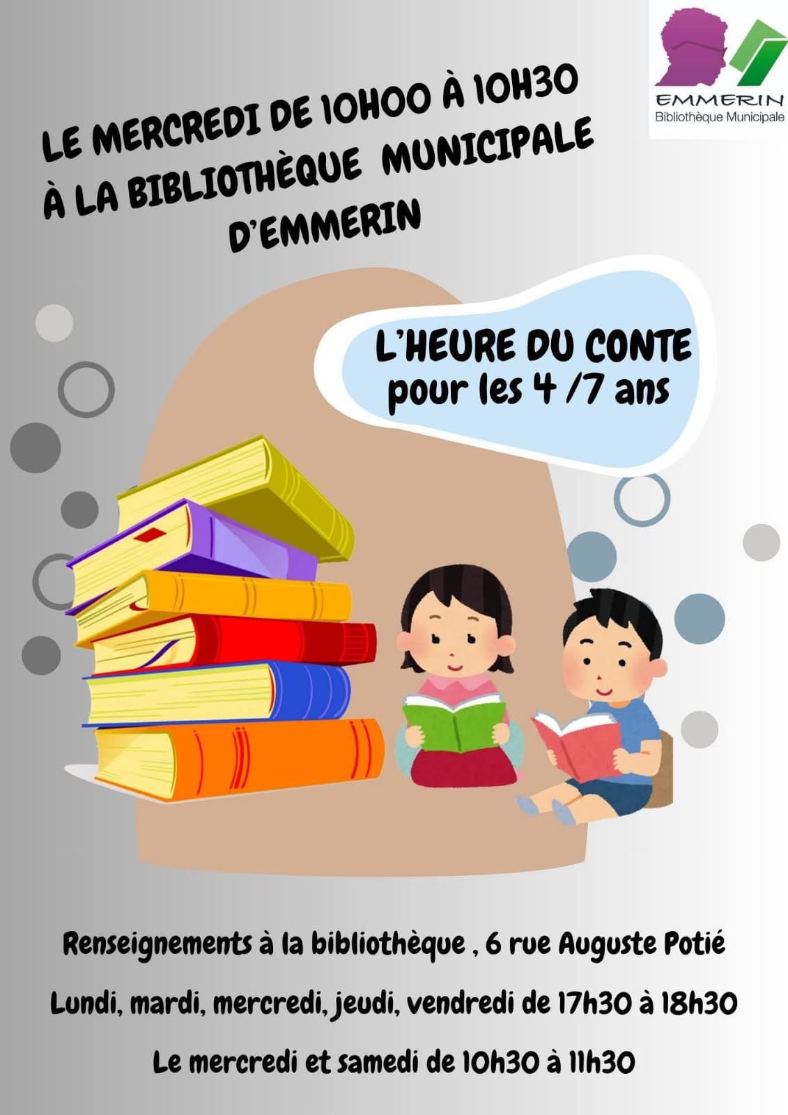 Le mercredi, de 10H à 10H30, nous accueillons les enfants de 4 à 6 ans qui aiment écouter des histoires.